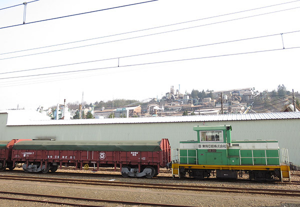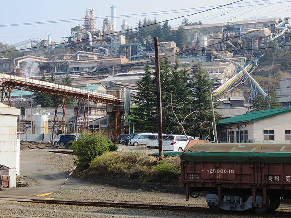 斜面に並ぶ工場設備は各地にあった鉱山の精錬所と似た景観。止められた貨車、頭上のパイプライン、吸い込まれていく専用線。日本の貨物輸送らしさが残っていた、金属精錬とともに歩んだ駅。