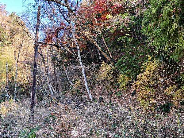 二俣尾駅のすぐ北側、脇道に沿って残る専用線の跡。青い空と赤黄緑に色づく木々の下、遥か昔に忘れられた架線柱。